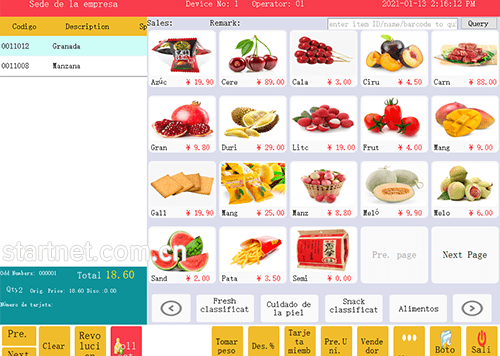 西班牙文版触摸屏POS收银界面——带货品图片的触屏界面,适合于餐饮、生鲜蔬果等货品数量不多的零售收银场景