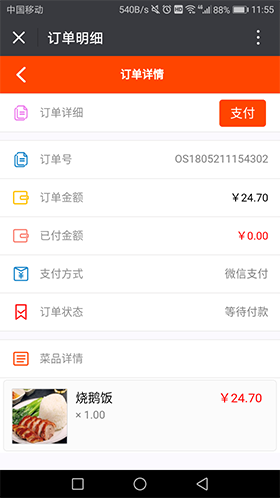 支持多种订单支付方式:支付宝、微信支付、现金到付、优惠券等。