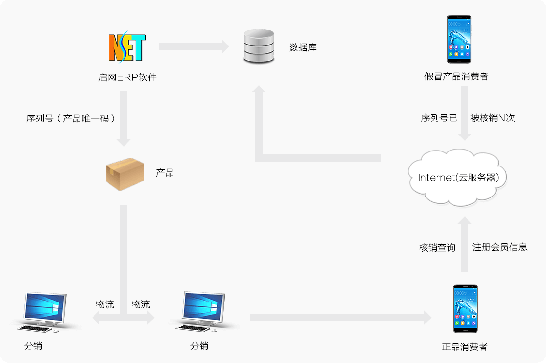 从采购来源、库存情况、内部调拨及销售去向等业务流程,都可以按全公司或分支机构,跟踪唯一序列号。充分运用这些特点,启网软件公司可以向用户提供产品防伪溯源系统。